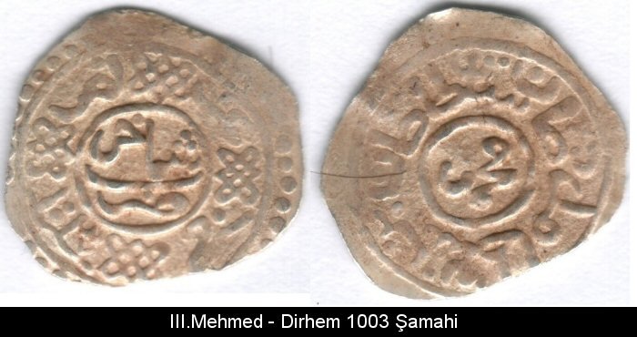 | 3) (Obv)“Sultan Murad/bin Sultan/Selim Han fi/l-berri (ve)l bahri” ,ortada “duribe Şamahi 1003”,çevrede “halled-Allahu teala mülkehu” (Allahu teala mülkünü devamlı kılsın). | ||||||||