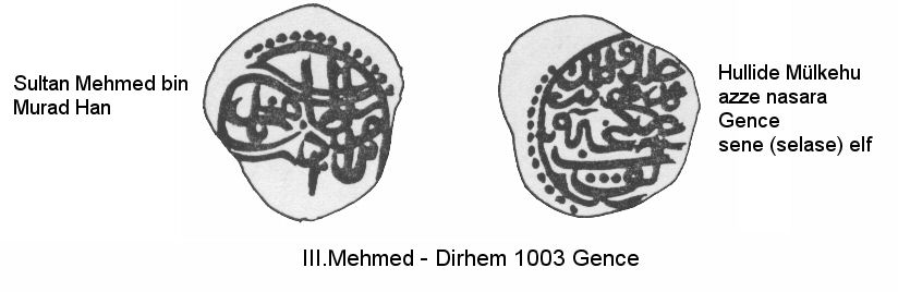 | 2) (Obv) "(Sultan Mehmed bin/Murad Han". (Rev) "Hullide (mülkehu)/Gence/(se)la(se)elf" | ||||||||