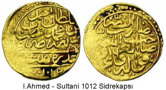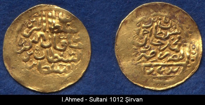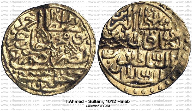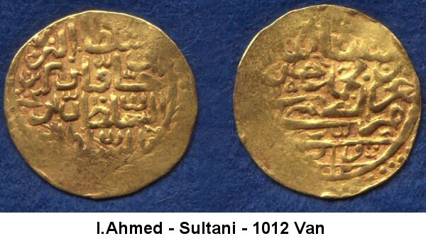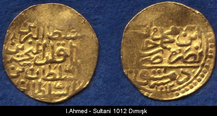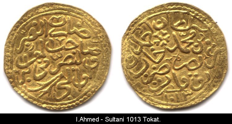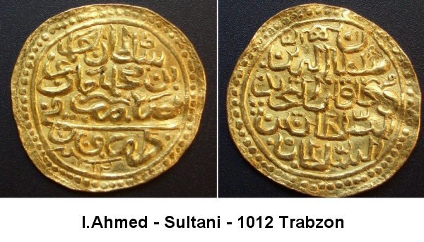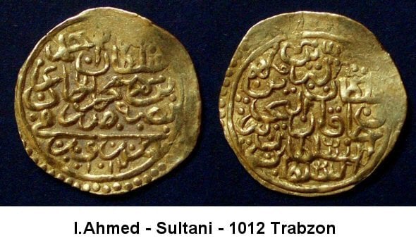 | 2)(Obv) Sultan Ahmed bin Mehmed Han azze nasara darebe Trabzon 1012. (Rev) Sultan ül berreyni ve hakan ül bahreyni es sultan bin essultan. | ||||||||