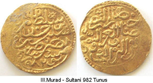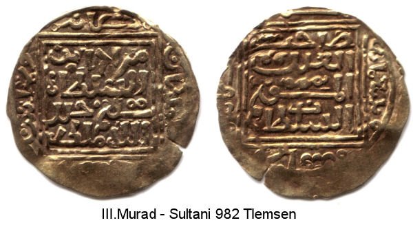 | 2) (Obv) Malik ül berreyn/vel bahreyn ve ebşam/vel Irakeyn hülledu/mülke"çevresinde devren"sene selase ve semaniyün ve tes'amiye Tlemsen. (Rev) Sahib el adil el müstakıym/essultan Murad bin/essultan Selim | ||||||||